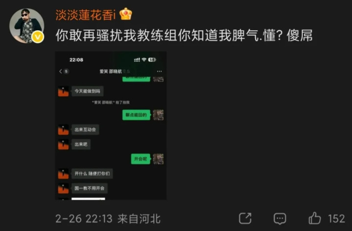 然后还在比赛开始之前骚扰JDG教练,给JDG教练发消息让他出来互动一下,JDG教练这边表示正在开会,结果爱笑直接说了一句:开什么,随便打你们,国一教练不用开会。后面还加了一个表情包,然后JDG教练这边就不回了。