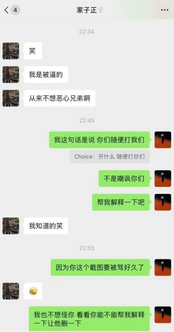 后面又说自己因为这个截图要被骂好久了,让他帮忙解释一下。